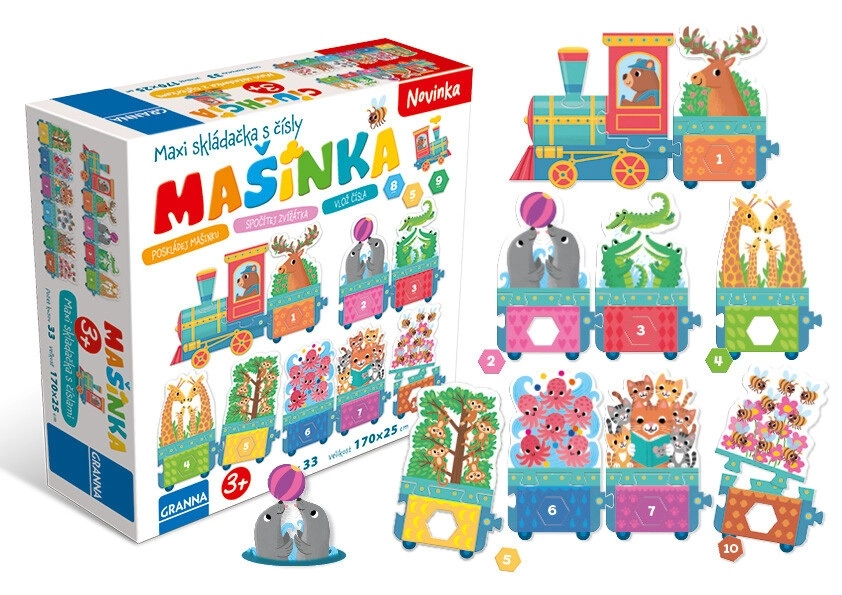 Con Granna Mašinka contare sarà davvero divertente! Questo maxi puzzle permette ai bambini di comporre il treno, collegare i vagoni, contare gli animali e imparare ad abbinare i numeri corretti.