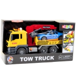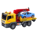 Il veicolo offre inoltre effetti luminosi e sonori, come l’allarme della sirena o i suoni della retromarcia, attivabili premendo i pulsanti posizionati sul tetto. Il carro attrezzi ha ruote in gomma antiscivolo che non graffiano i pavimenti e consentono una guida sicura in casa. Include anche un’auto sportiva blu, che può essere manovrata o usata separatamente per il gioco.