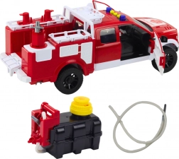 Il camion dei pompieri è realizzato in plastica di alta qualità e include numerosi elementi funzionali. Sul tetto del veicolo si trova un serbatoio rimovibile con pompetta e tubo flessibile, che permette di giocare a spegnere gli incendi spruzzando acqua. Il bambino può così immaginare di essere un vero pompiere e aiutare a "spegnere" incendi immaginari a casa, in giardino o al parco giochi.