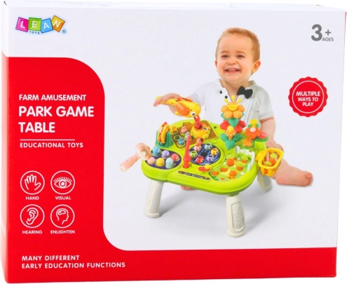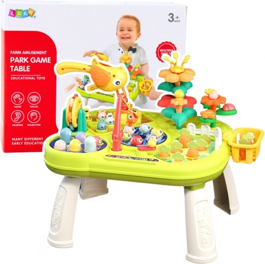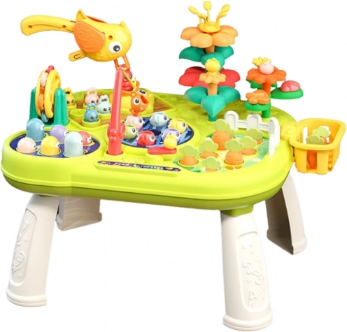 Il set include diverse funzioni come la pesca dei pesciolini con una speciale canna, il gioco acchiappa-talpa (whack-a-mole), il giardinaggio e l’abbinamento di forme e colori. Ogni attività sostiene differenti aree di sviluppo, come la coordinazione occhio-mano, il pensiero logico, la concentrazione e l’apprendimento delle relazioni spaziali di base. Elementi colorati e dinamici stimolano i sensi.