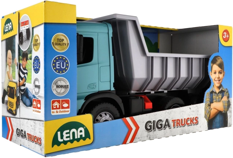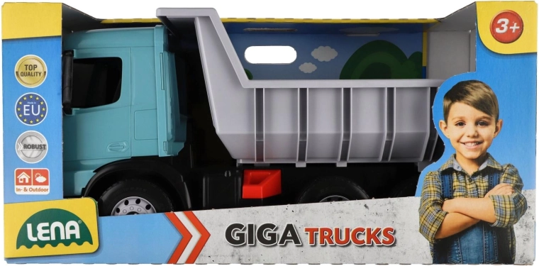 Questo robusto ribaltabile della linea Giga Trucks è pensato per piccoli costruttori. Grazie alla grande vasca ribaltabile con blocco di sicurezza, trasporta senza problemi anche carichi più grandi e li scarica in modo sicuro. I dettagli realistici della cabina AROCS favoriscono il gioco creativo e a tema in cantiere, in giardino o nella cameretta.