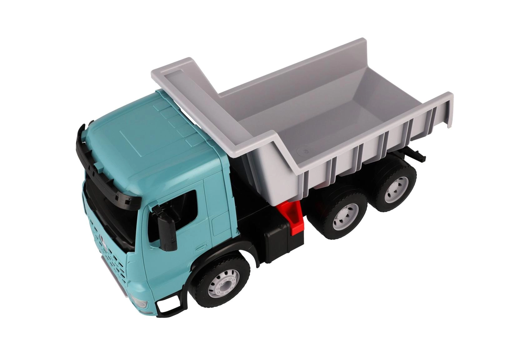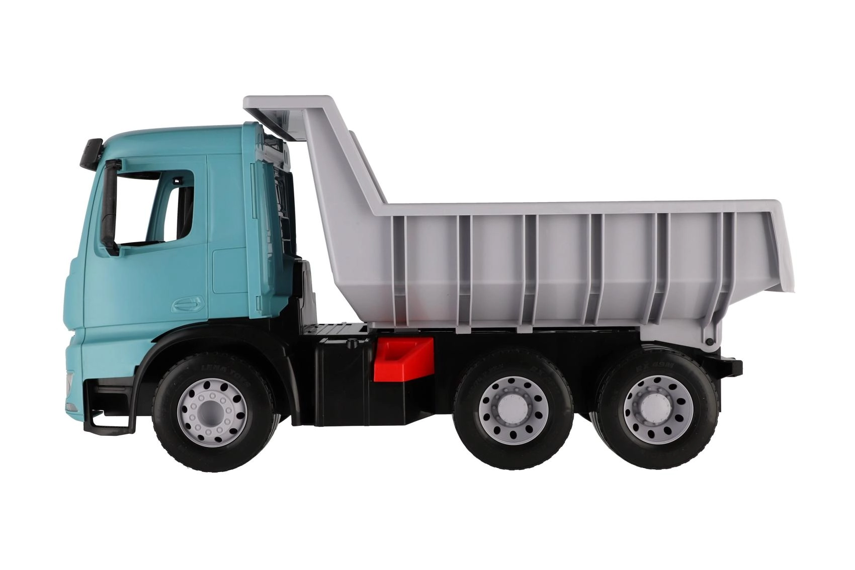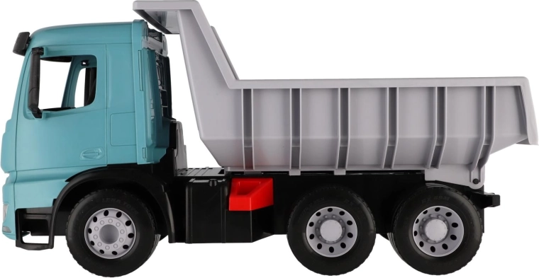 Grande camion ribaltabile in plastica per bambini dai 3 anni con aspetto realistico del MERCEDES-BENZ AROCS. Offre una vasca spaziosa con blocco di sicurezza contro il ribaltamento involontario, struttura resistente in plastica di qualità e un moderno design turchese-grigio. Ideale per giocare in casa e all'aperto, per trasportare sabbia, giocattoli e tanta fantasia.