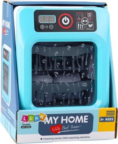 Lavastoviglie giocattolo blu per bambini con effetti realistici per un gioco divertente ed educativo.