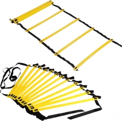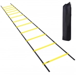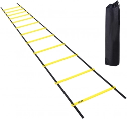 La scala di allenamento è realizzata in PVC resistente e cinghie in polietilene, rendendola resistente all'uso intensivo sia al chiuso che all'aperto. La scala ha 12 pioli regolabili che permettono di adattare gli spazi per specifici esercizi e livelli dell'utente.