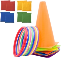 Il contenuto del set include 11 cerchi colorati, eccellenti per giochi di lancio e attività di abilità, 6 coni da allenamento per percorsi ad ostacoli e 10 sacchetti per ginnastica che possono essere utilizzati per giochi sensoriali, lancio o come pesi. Tutti i componenti sono realizzati con materiali durevoli e sicuri, adatti a bambini e adulti.