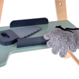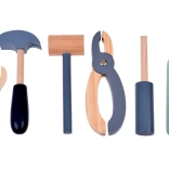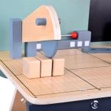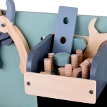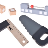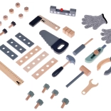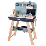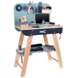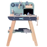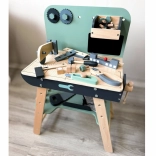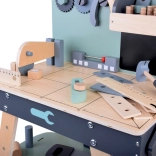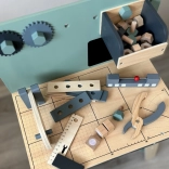 Il set è realizzato in legno resistente e contiene strumenti come martelli, chiavi inglesi, cacciaviti e altro ancora. Tutti gli elementi sono sicuri, arrotondati e realizzati con attenzione ai dettagli. Lo spazio del laboratorio è anche equipaggiato con una piccola lavagna per progettare i progetti.