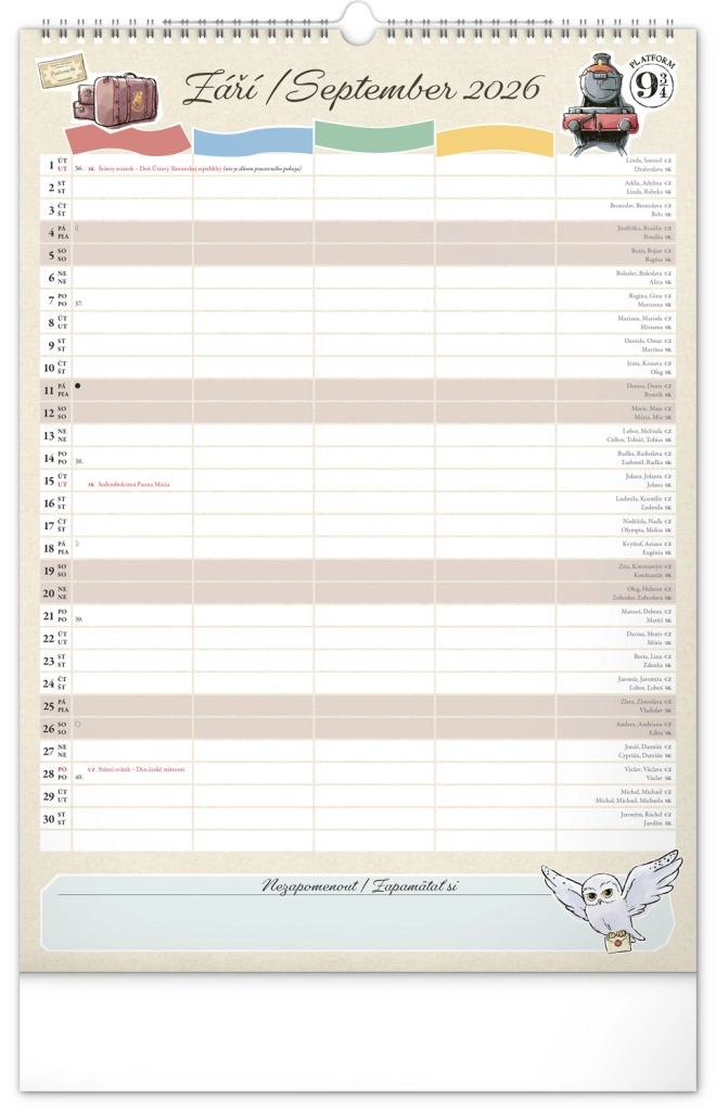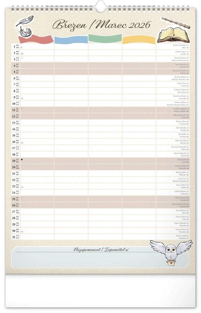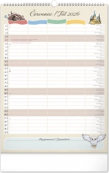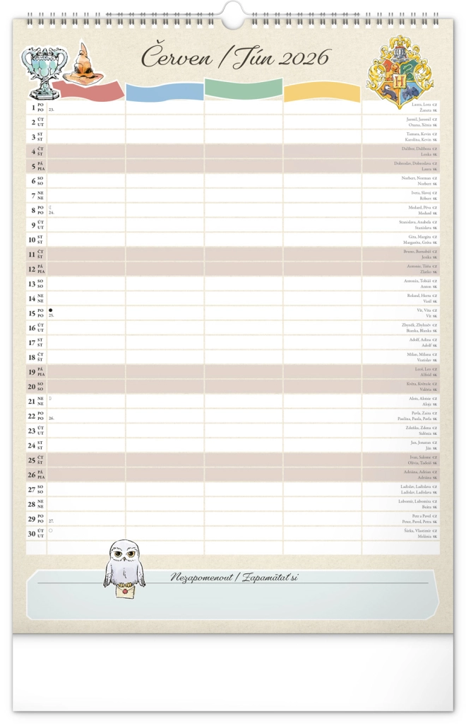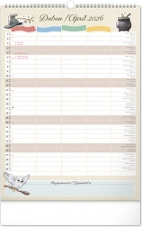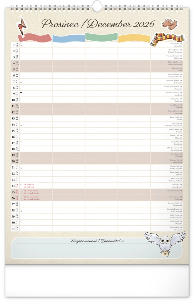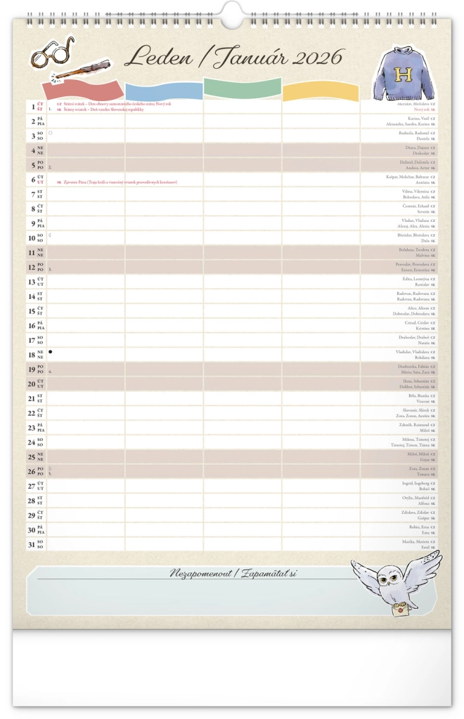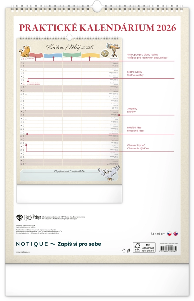 Presentiamo il calendario familiare da parete che porterà la magia del mondo di Harry Potter nella tua casa. Ogni mese puoi goderti immagini e motivi dei tuoi eroi e luoghi preferiti del mondo magico. Questo calendario non dimentica il calendario ceco e slovacco, include festività nazionali e fasi lunari, ed è un aiuto ideale per l'organizzazione delle attività di babbani e maghi.