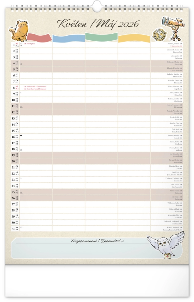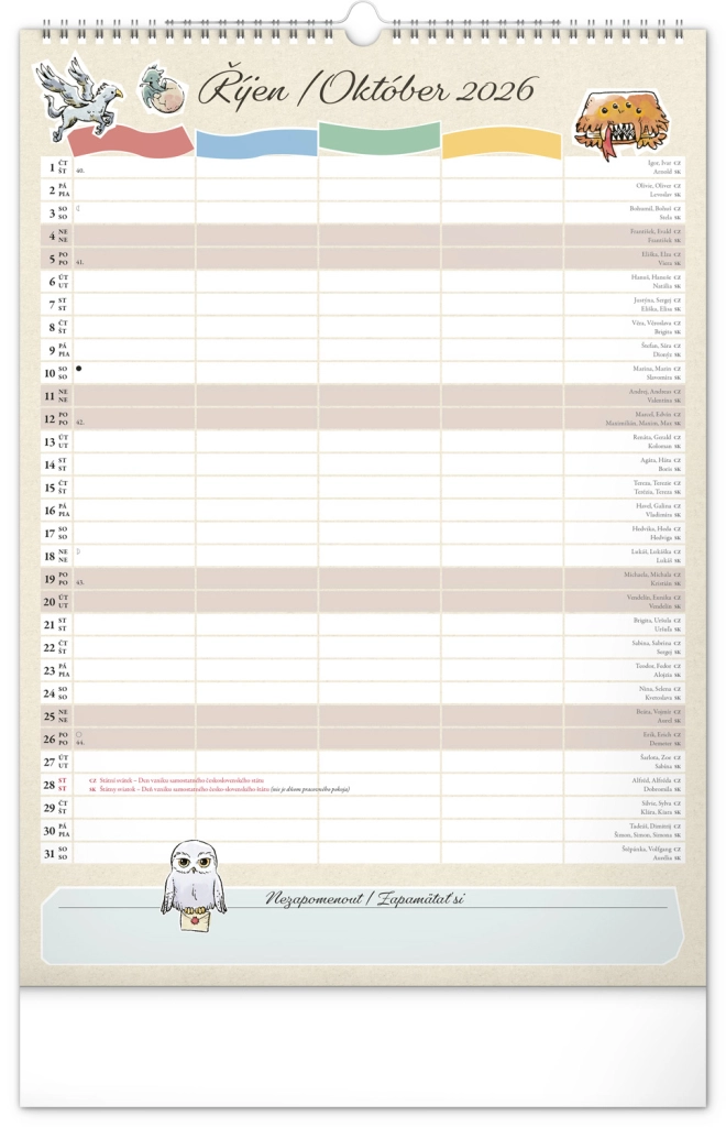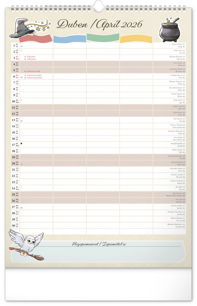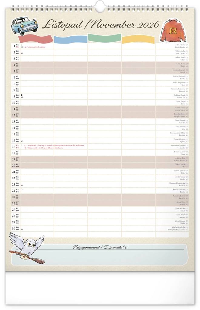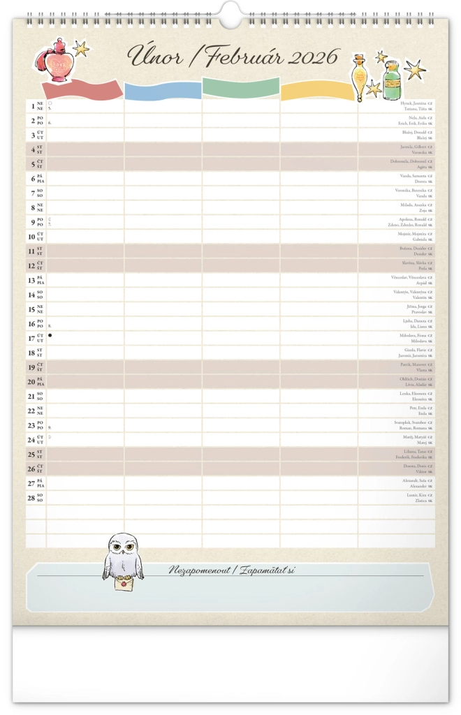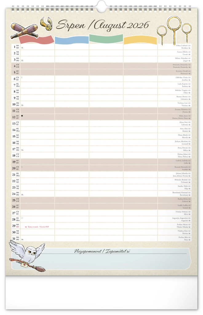 Presentiamo il calendario familiare da parete che porterà la magia del mondo di Harry Potter nella tua casa. Ogni mese puoi goderti immagini e motivi dei tuoi eroi e luoghi preferiti del mondo magico. Questo calendario non dimentica il calendario ceco e slovacco, include festività nazionali e fasi lunari, ed è un aiuto ideale per l'organizzazione delle attività di babbani e maghi.