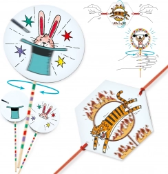 Scoprite la magia delle antiche illusioni ottiche con il DJeco DIY taumatropo Circo, dove i bambini possono creare le proprie storie in movimento utilizzando uniche schede circolari e nastri.<\div>