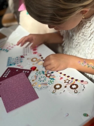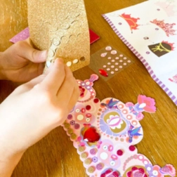 I “gioielli” adesivi e gli elementi scintillanti si applicano con facilità, così anche i più piccoli possono creare design belli e originali senza disordine.