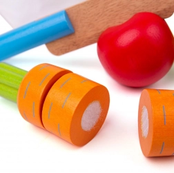 Set colorato per il gioco da piccolo chef con verdure di legno con velcro, coltello sicuro e cappello bianco. Sostiene la motricità fine, la creatività e insegna un'alimentazione sana e la sicurezza in cucina.