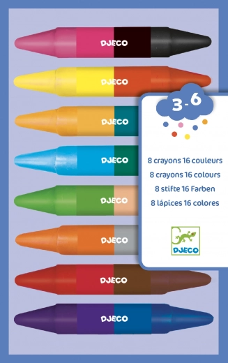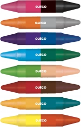 I pastelli a cera bifacciali del marchio DJECO offrono ai bambini possibilità illimitate nella creazione. Ogni pastello ha due diverse punte, che consentono di combinare colori e provare varie tecniche di disegno.