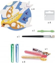Contenuto della confezione: 4 carte prestampate e pre-adesive (Ø 21 cm), 4 tubetti di glitter, confezione di mini strass, utensile in plastica, pennello e istruzioni illustrate passo dopo passo.
