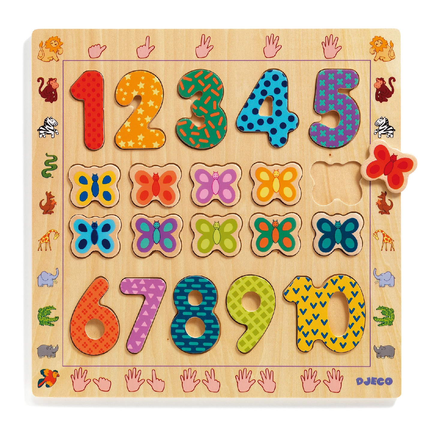 Immergetevi nel mondo dell'apprendimento divertente con il puzzle a incastro DjECO Contare con farfalle. Progettato per sviluppare le capacità motorie e di calcolo dei vostri bambini.