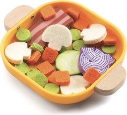 1 padella in legno con velcro, 1 spatola in metallo, 1 piatto, 6 alimenti in legno con velcro, 28 pezzi in feltro