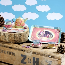 Questo bellissimo set da tè in metallo con illustrazione fiabesca della "foresta magica" è speciale perché suona musica durante il servizio. Contiene 14 pezzi di stoviglie, ideali per le mani dei bambini, ed è realizzato in Francia.