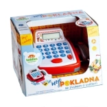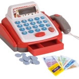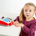 Cassa giocattolo per bambini divertente e realistica per piccoli commessi. Offre una calcolatrice funzionante con display, un cassetto portadenaro apribile e un lettore di codici a barre con luce e suono. Giocattolo ideale per sviluppare fantasia, calcolo e abilità sociali.