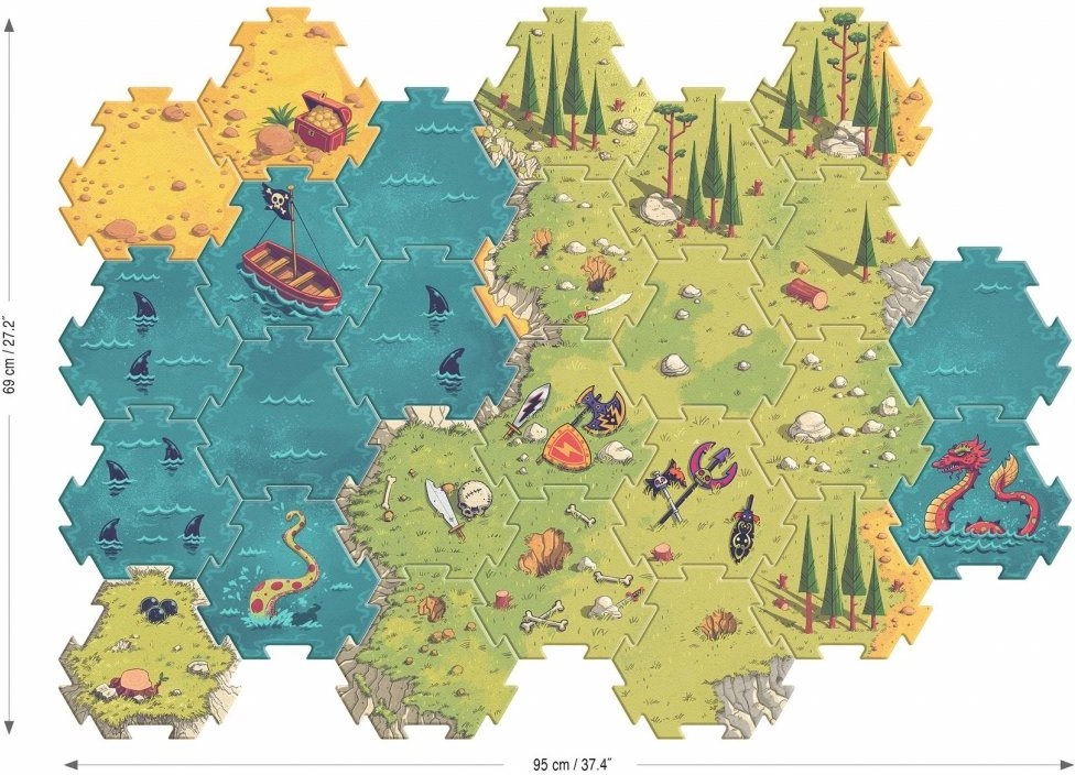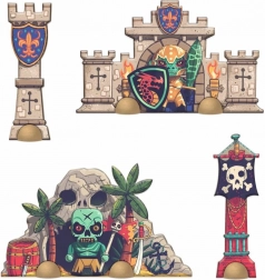 Questo set originale combina il piacere del puzzle con il gioco creativo. 26 grandi pezzi esagonali permettono di comporre una scena ampia, mentre 4 scenografie verticali su basi in legno donano all’intera battaglia un effetto tridimensionale. I pezzi sono realizzati in cartone molto resistente certificato FSC®, per resistere anche a un uso frequente.