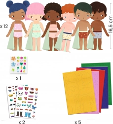 Il set creativo per vestire i personaggi di Djeco stimola la fantasia dei bambini e la loro motricità fine. Con l'aiuto di feltro adesivo e decorazioni, i bambini dai 3 ai 6 anni possono creare le proprie variazioni di abbigliamento per 12 personaggi.
