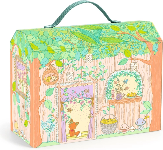 La valigetta pieghevole con illustrazioni del bosco, una volta aperta, diventa una scena a più piani con mensoline, tavolino e cortile ripiegabile.
