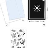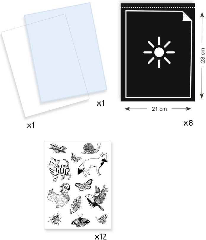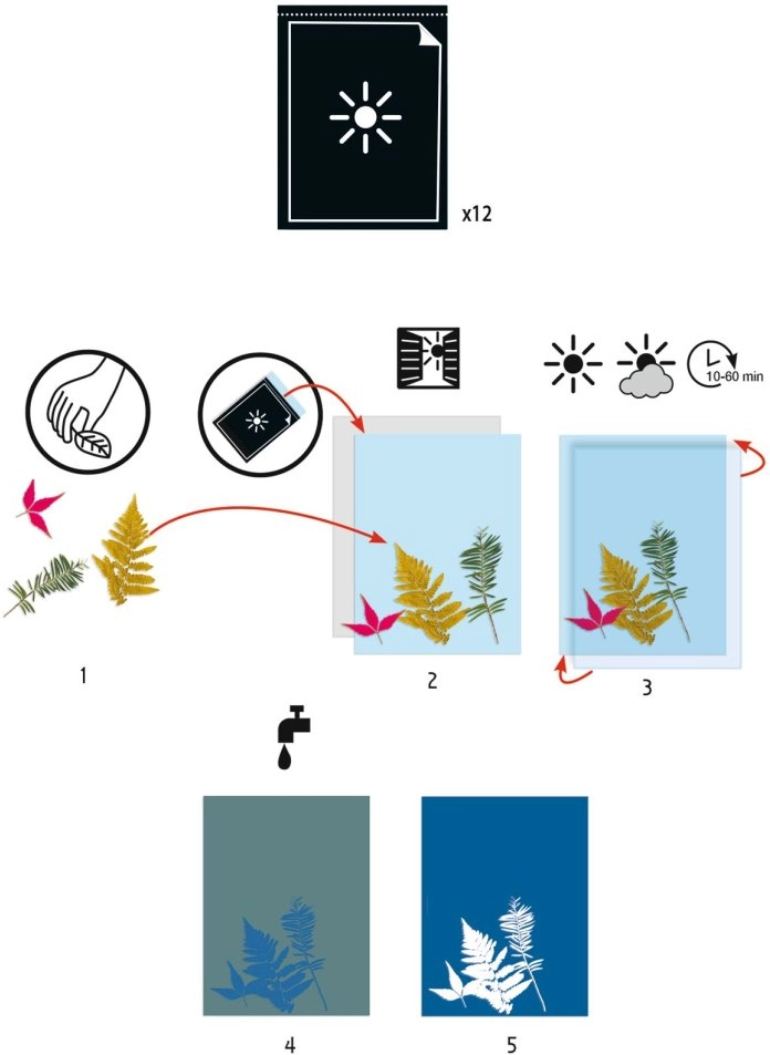 Il set per cianotipia del marchio Djeco offre un modo semplice per creare immagini suggestive con la luce solare. Posizionate i motivi stampati sulla carta fotosensibile, coprite con il plexiglass, lasciate esporre brevemente e, dopo il risciacquo con acqua, la scena si rivelerà sul caratteristico sfondo blu. Il risultato è sempre sorprendente e bellissimo.