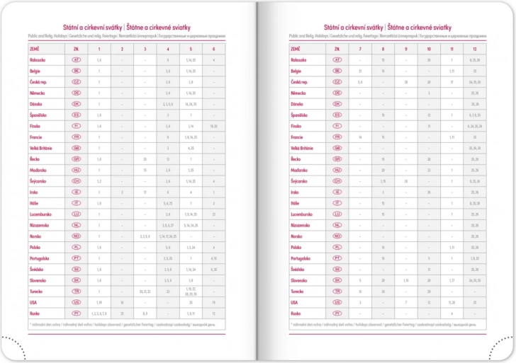 Grazie al calendario dettagliato e versatile, che include un calendario ceco-slovacco integrato con inglese, tedesco, ungherese e russo, puoi facilmente pianificare qualsiasi giorno o evento.