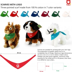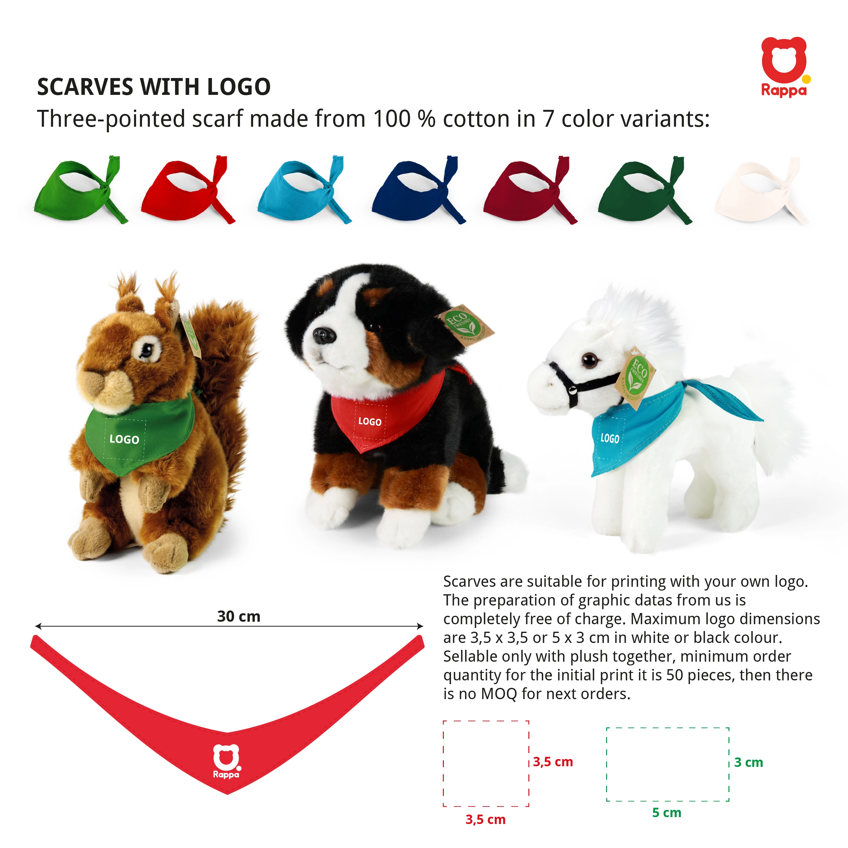 Accessorio elegante per i tuoi amici di peluche: foulard verde scuro adatto a giocattoli fino a 30 cm. Ideale per il branding – possibilità di stampa del tuo logo gratuita. Avvertenza: non vendibile separatamente, disponibile solo con peluche selezionati in modalità all’ingrosso.