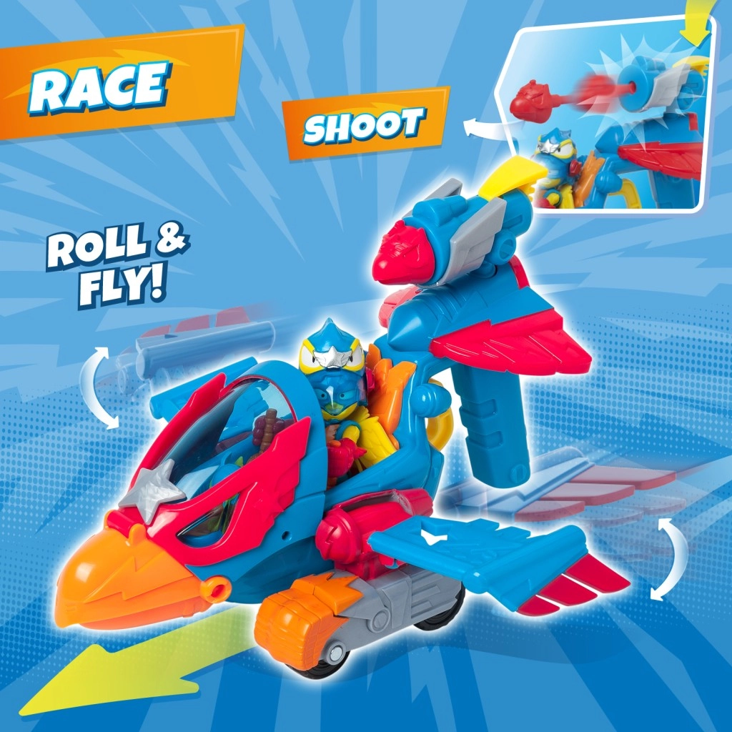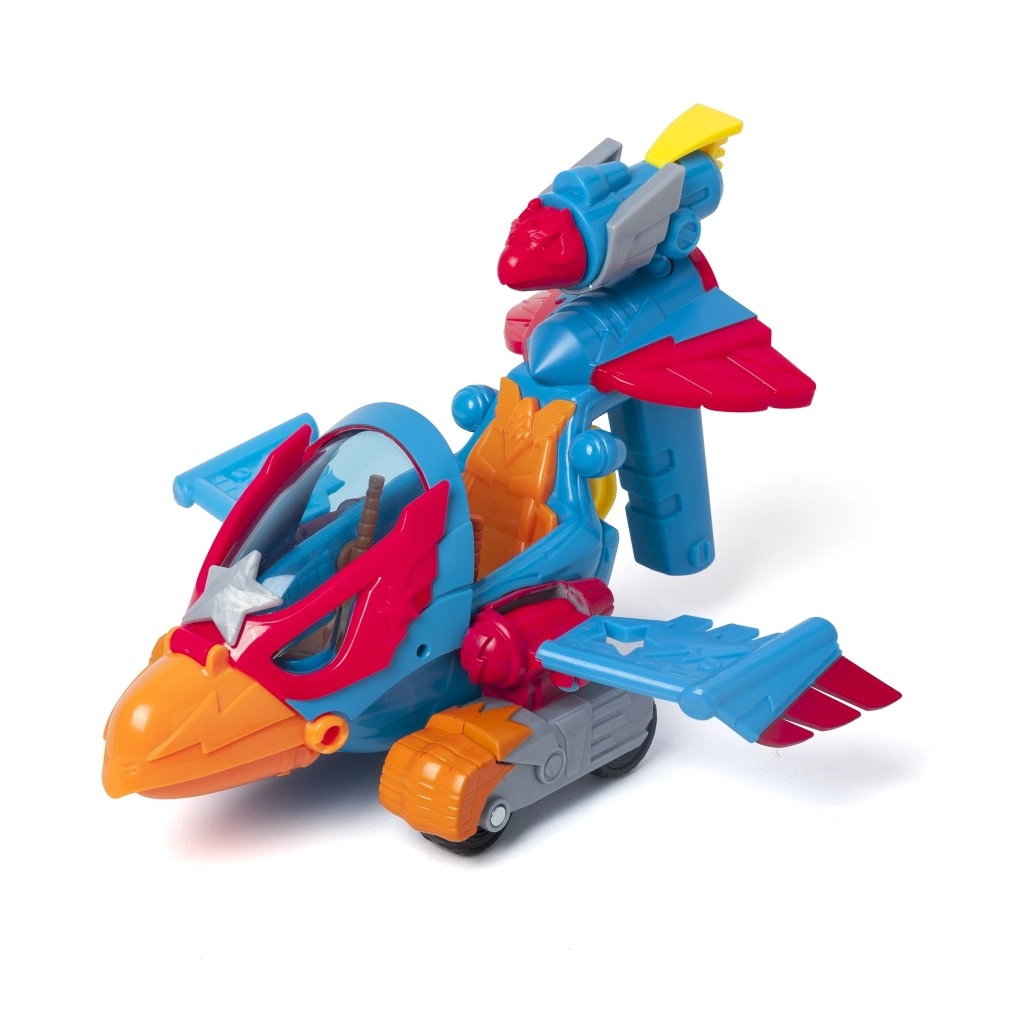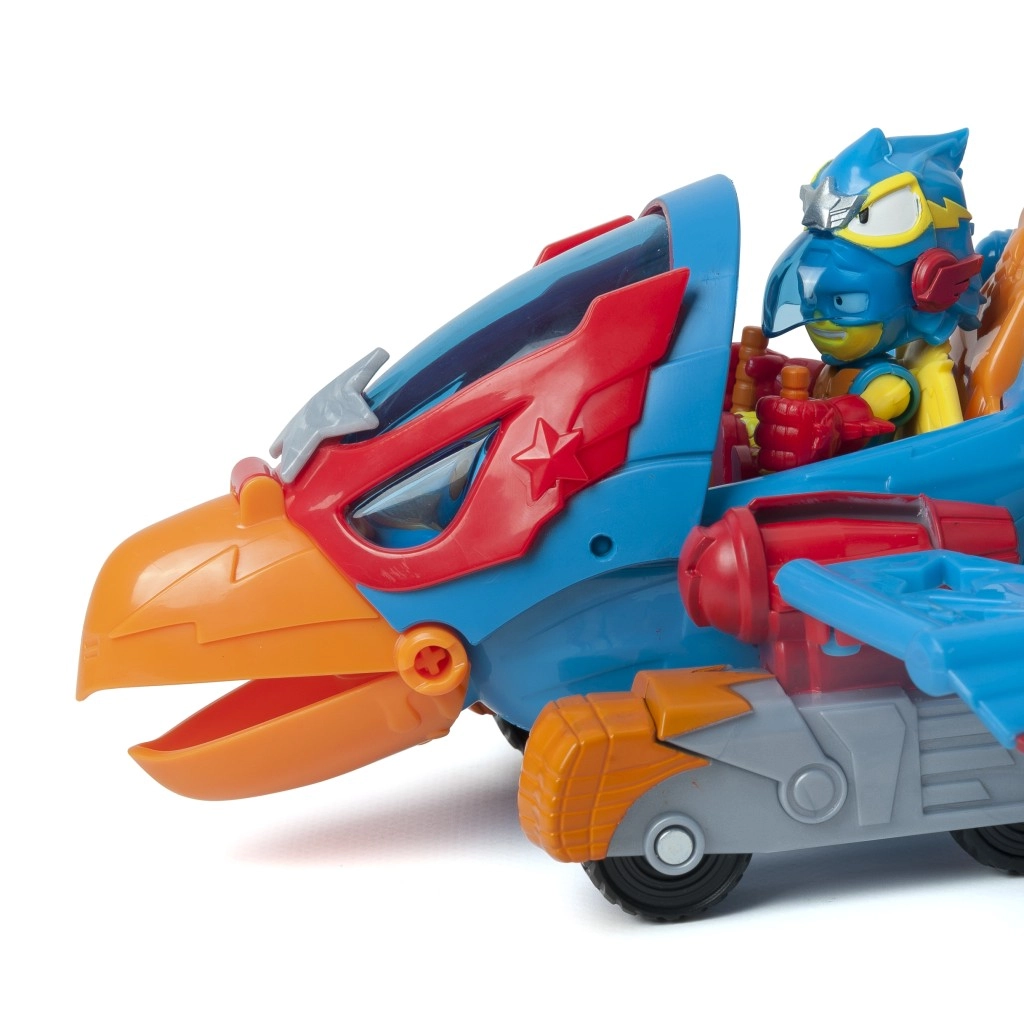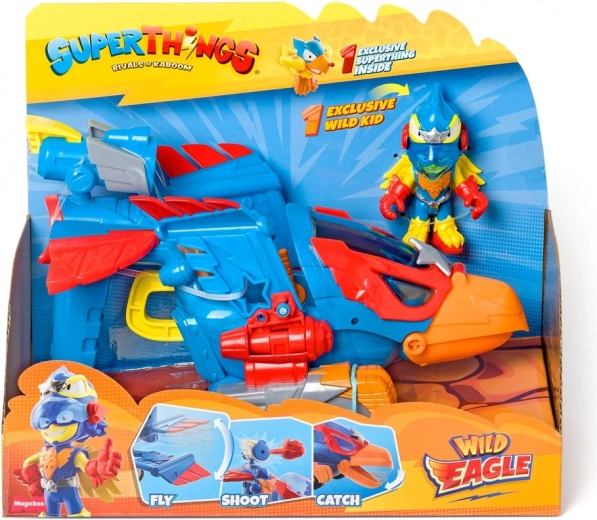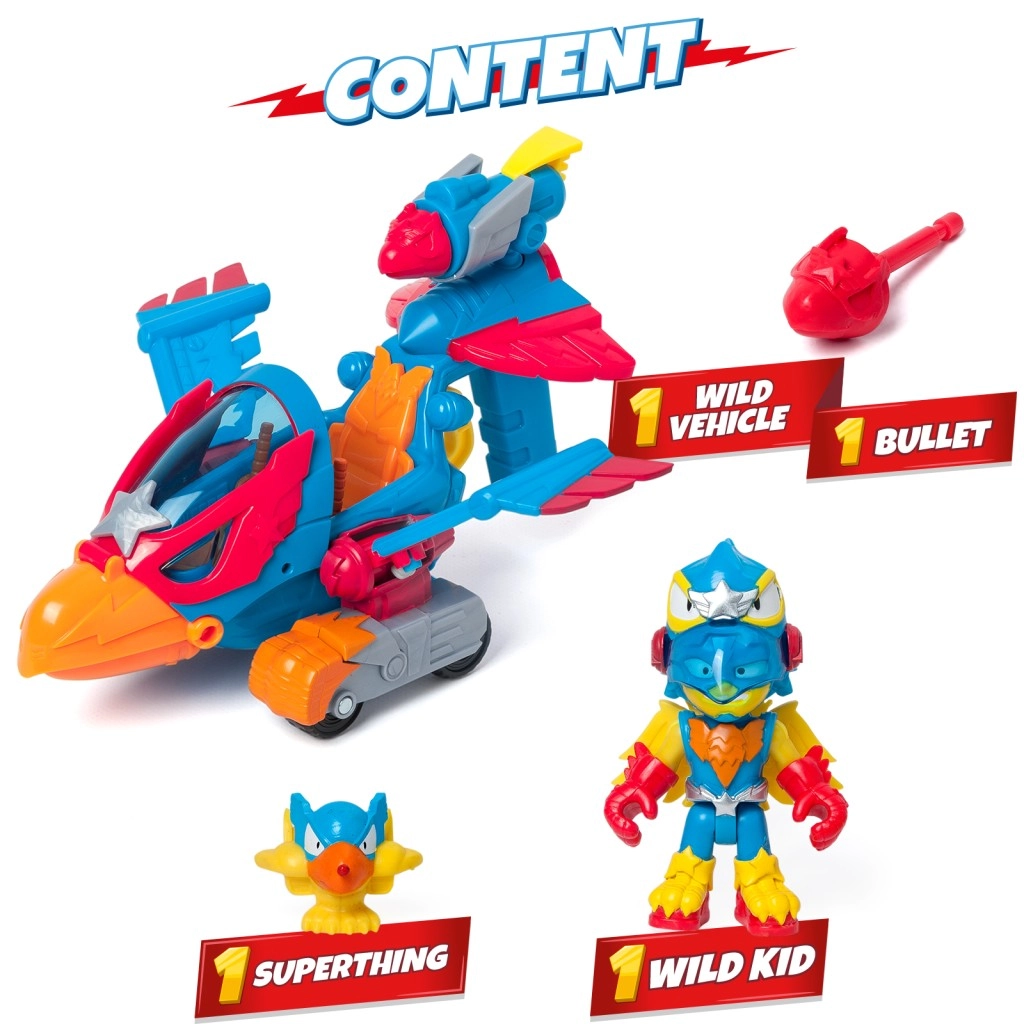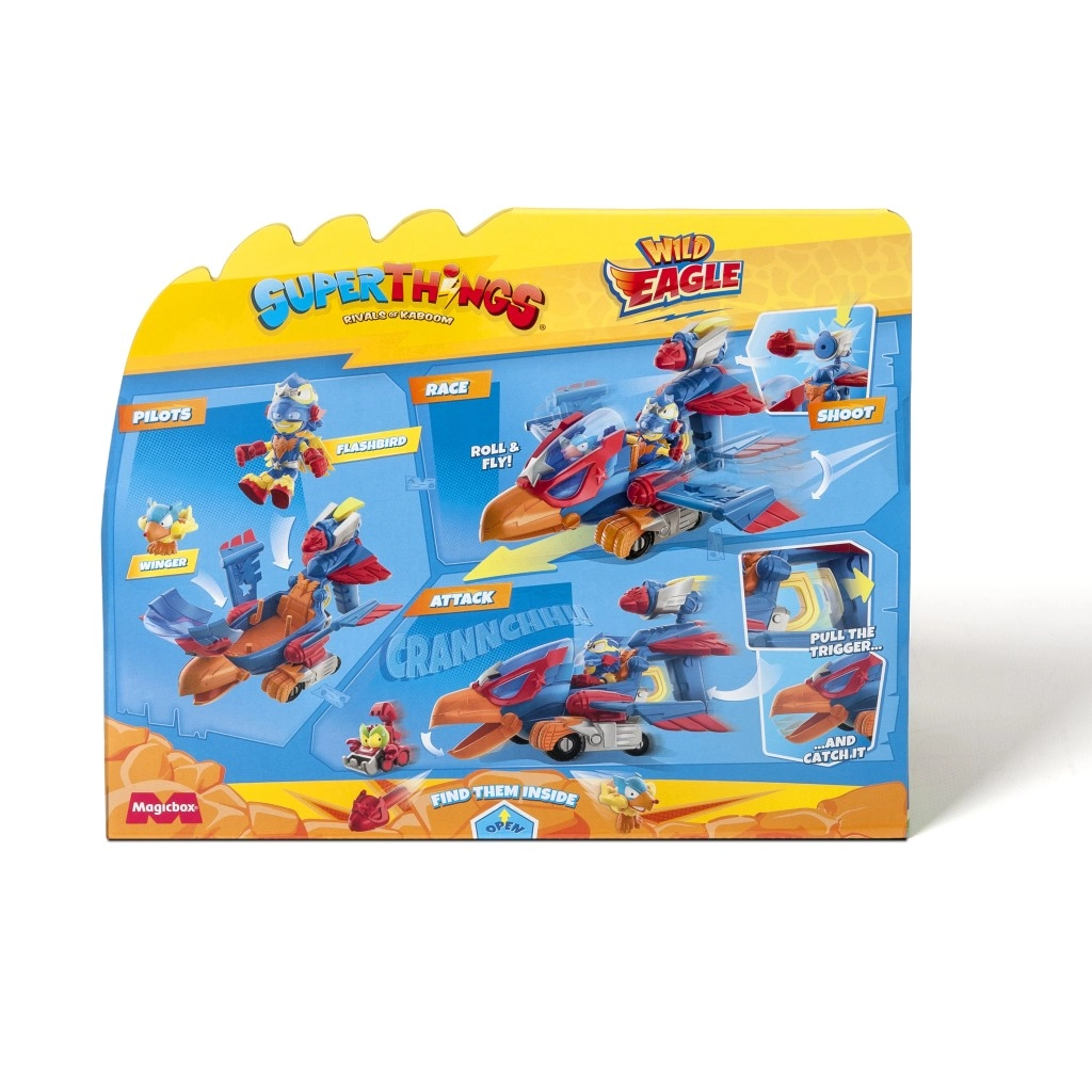 Entra nel mondo delle avventure con unico Kid e SuperThing, che possono volare nell'abitacolo del Wild Eagle Jet. Le ali mobili aggiungono realismo, mentre la rotazione del grilletto promette di abbattere i cattivi o di catturarli con il becco.