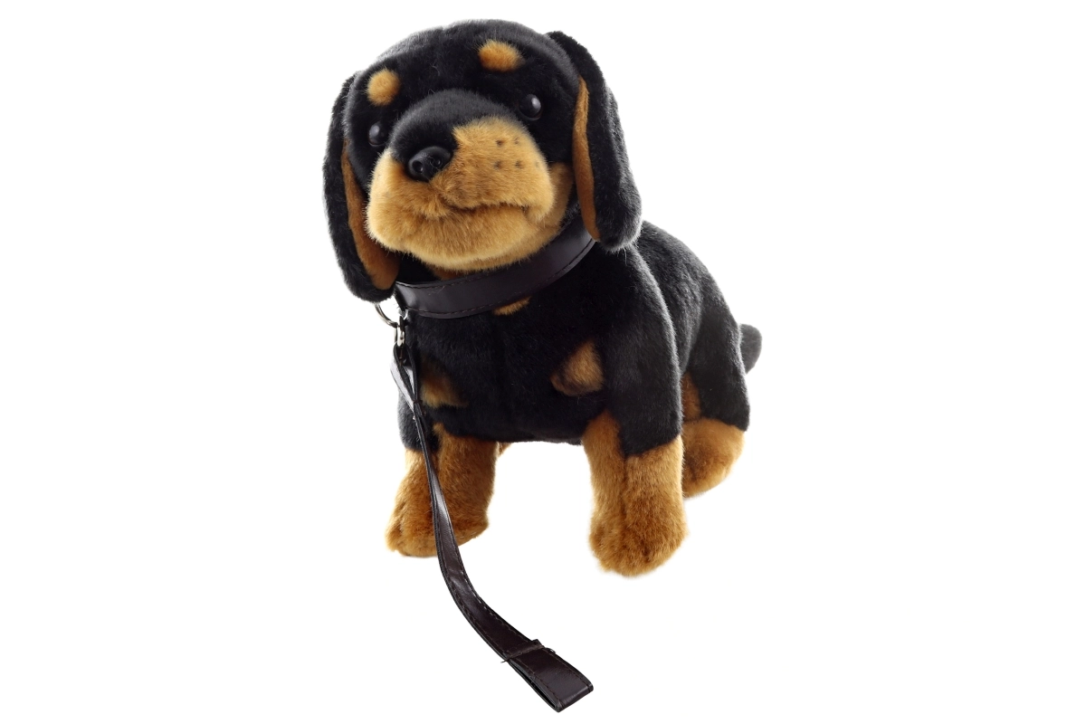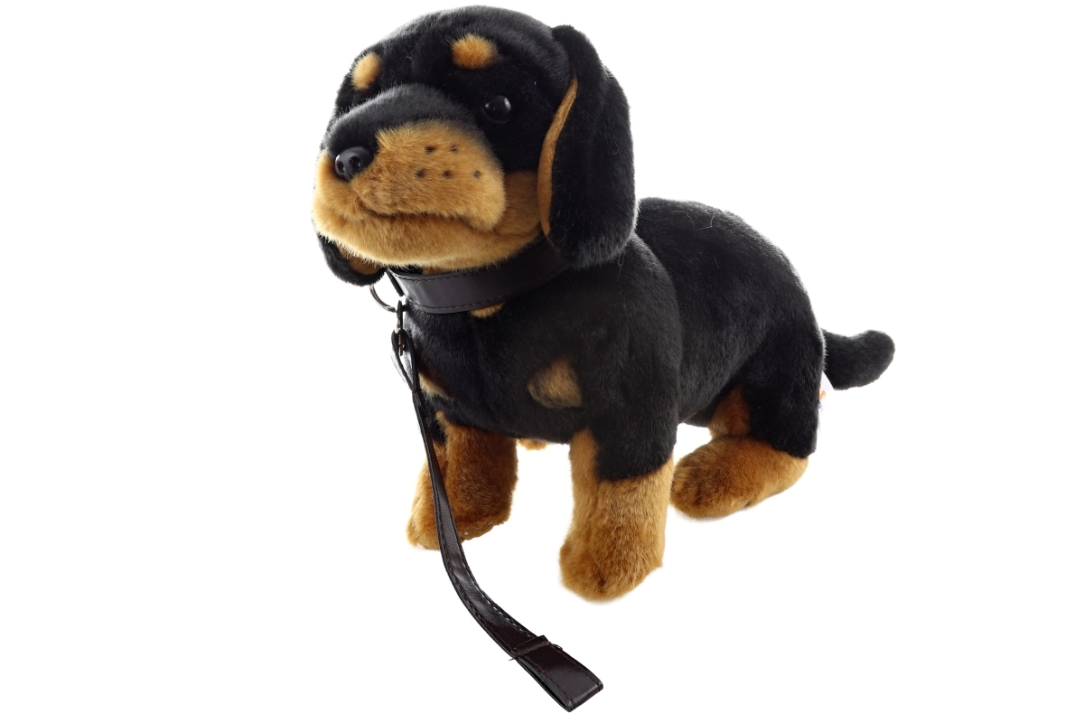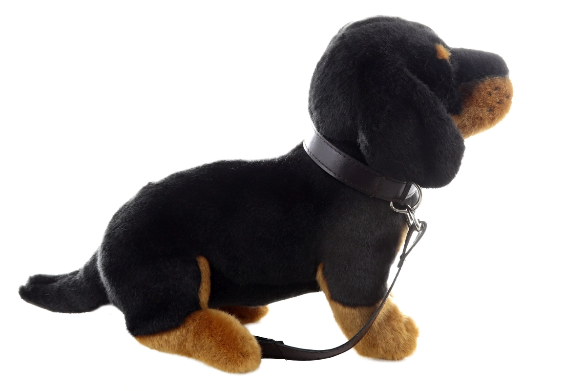 Bassotto di peluche con guinzaglio, ideale per i più piccoli, porta gioia e sicurezza. Realizzato con materiali ecologici, perfetto sia come proprietà sia come regalo.