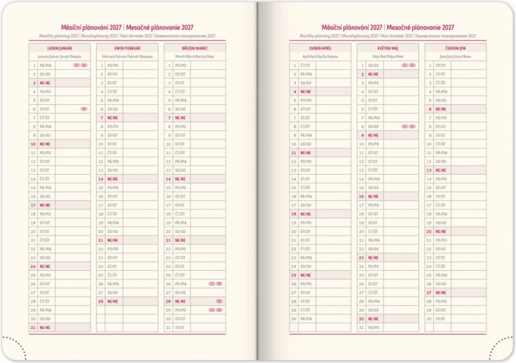 L'agenda contiene un calendario giornaliero con calendario ceco-slovacco e lingue aggiuntive, tra cui inglese, tedesco, ungherese e russo.