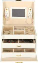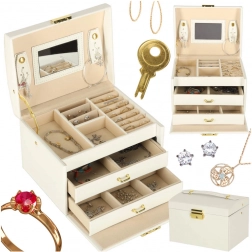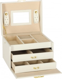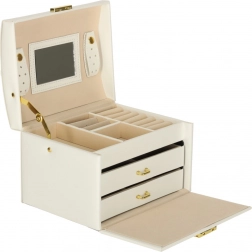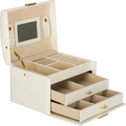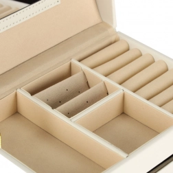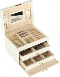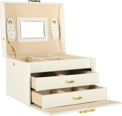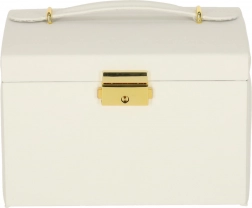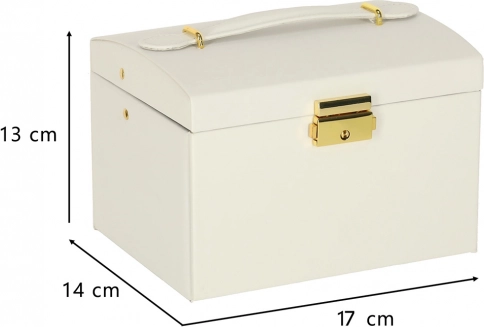 La lavorazione resistente, il colore bianco con dettagli dorati e la possibilità di chiusura con chiavetta assicurano un deposito sicuro dei tuoi tesori a casa e in viaggio. Il portagioie è leggero, compatto e al tempo stesso abbastanza capiente per una collezione più ampia.