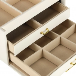 I cassetti inferiori con morbida imbottitura sono ideali per bracciali, collane e accessori più grandi. Facili da estrarre grazie alle maniglie dorate.