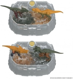 1 figurina di dinosauro eroe, 1 figurina di dinosauro cattivo, campo di gioco