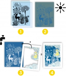 Con questo affascinante set puoi diventare il creatore di design unici che appaiono sulla carta grazie all'effetto della luce. Basta esporre la carta alla luce solare e osservare come i motivi ombreggiati emergono sullo sfondo scuro.