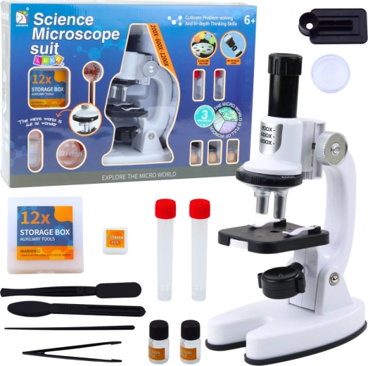 Il set include una serie di strumenti indispensabili - pipetta, pinzette, campioni, flaconcini, contenitori e vetrini che permettono di condurre vari esperimenti e osservazioni interessanti. Tutto è confezionato in un imballaggio robusto, il che rende il microscopio un regalo ideale.