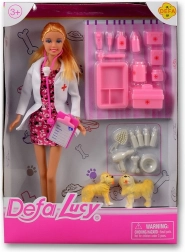 Diventa una veterinaria con la bambola Lucy e i suoi adorabili cagnolini. Set completo con camice bianco e accessori per l'esame dei pazienti animali.