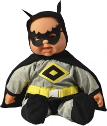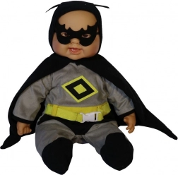 La bambola ha un outfit grigio con elementi neri e gialli, maschera e mantello, inclusa una cintura gialla con fibbia chiara.