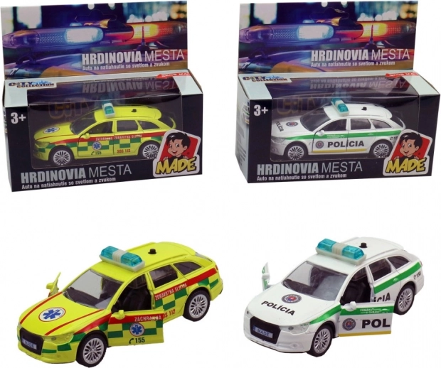 Auto di soccorso e polizia per bambini con effetti realistici. Trazione a retrocarica.