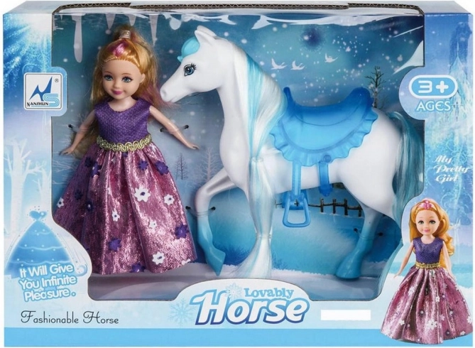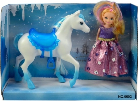 Bambola con cavallo 15 cm, ideale per bambini dai 3 anni. Giocattolo in plastica resistente in confezione pratica.