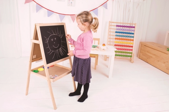 Questa lavagna magnetica multifunzionale per bambini offre da un lato una superficie cancellabile a secco per pennarelli e sull'altro lato una tradizionale lavagna per gessetti. Tra le lavagne è nascosta un'asta su cui si può fissare un rotolo di carta.