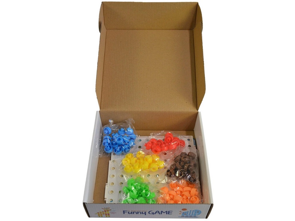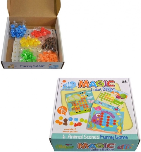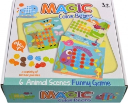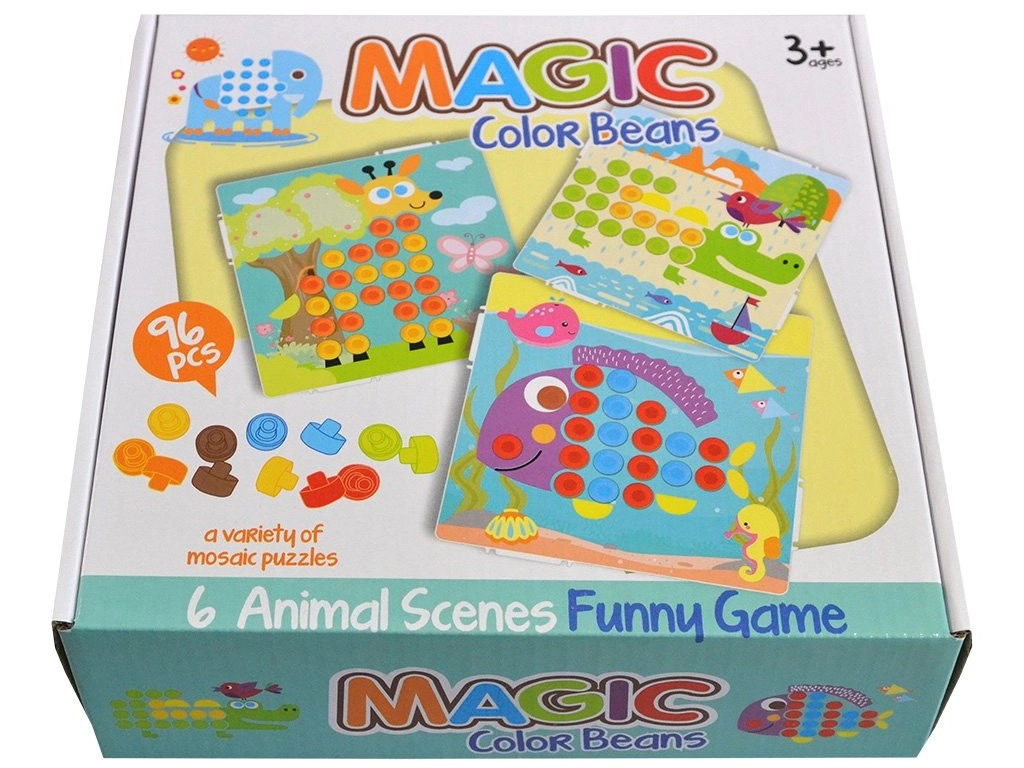 Mosaico con modelli colorati ideale per bambini creativi. Contiene 6 diversi ambienti dove vivono gli animali. I bambini possono completare il corpo degli animali con cappucci multicolori.