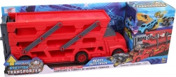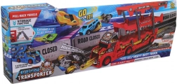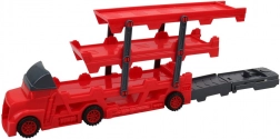 Vi presentiamo il camion rosso con rimorchio, che non è solo un semplice punto di trasporto per le vostre macchinine, ma nasconde anche una pista da corsa per momenti pieni di tensione e adrenalina.