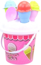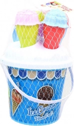 Il set include un secchiello con manico per un facile trasporto in spiaggia o nel parco giochi. Il secchiello è decorato con suggestive grafiche di gelato.