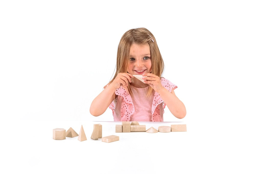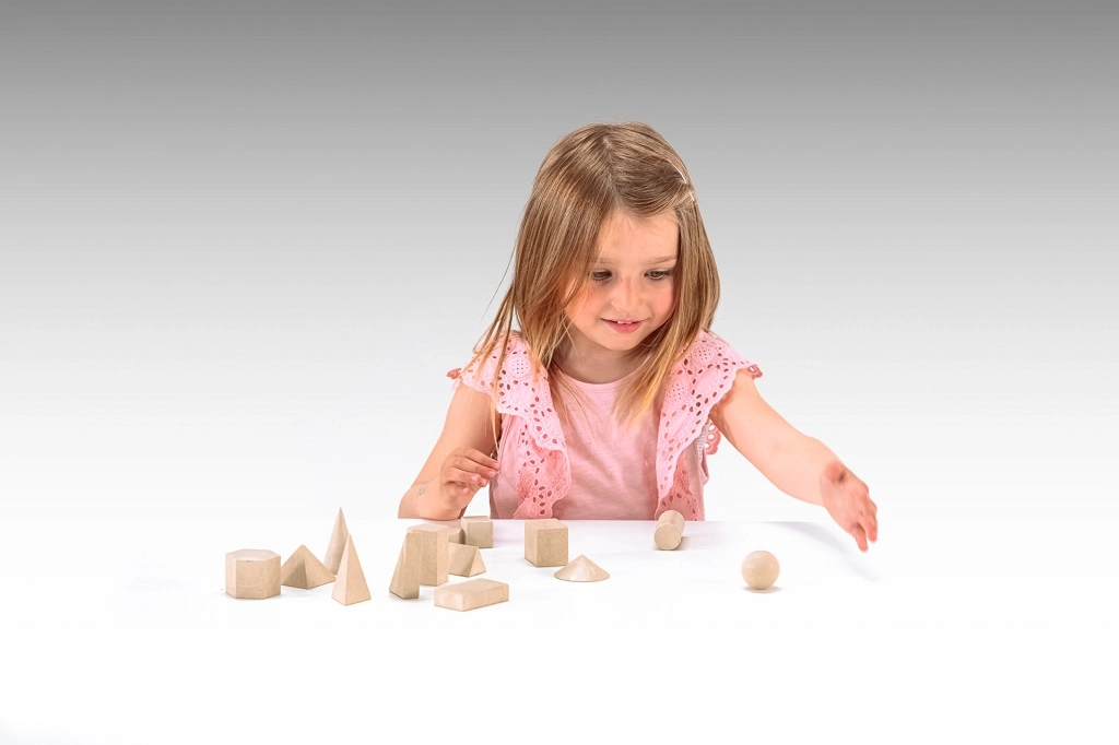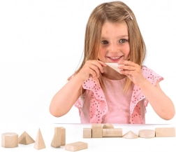 Questo set in legno include 14 diverse figure geometriche, servendo come strumento ideale per l'apprendimento iniziale della geometria. I bambini impareranno a riconoscere forme come cubo, parallelepipedo, prisma, cilindro, piramide, cono e sfera.
