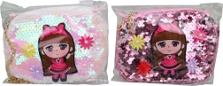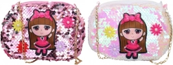 La borsetta cosmetica decorata con paillettes e un design carino di una bambina porta gioia e divertimento nel mondo della moda.