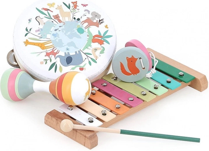 Scopri il magico set musicale in legno di Vilac, illustrato da Sarah Betz, che introduce i bambini al mondo del ritmo e dei suoni. Ideale per lo sviluppo della motricità fine, della creatività e della sensibilità musicale.