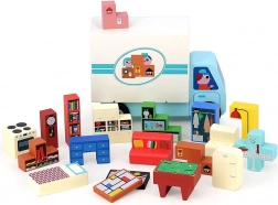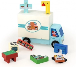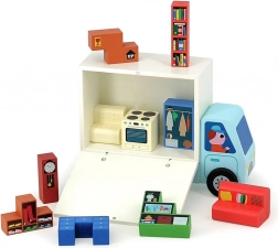 Il set contiene un camion di trasloco in legno e 19 pezzi di blocchi di mobili, ideali per il gioco autonomo o in famiglia.