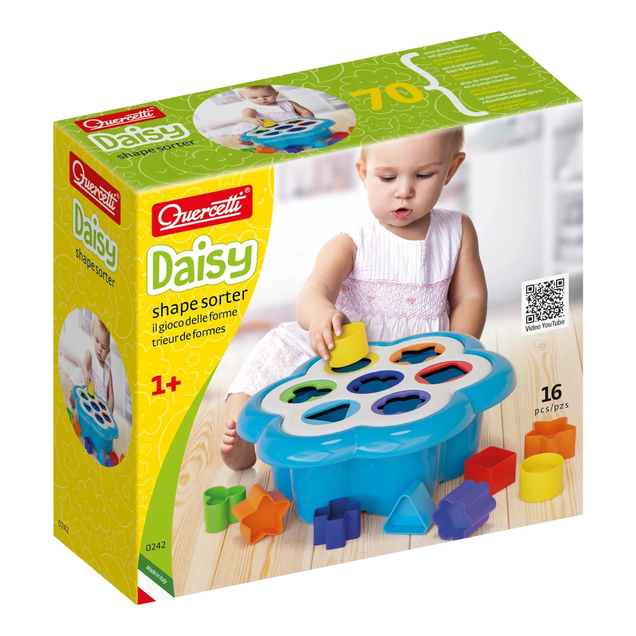 Il popolare inseritore QUERCETTI DAISY sviluppa l'immaginazione dei bambini, la motricità fine e il riconoscimento di forme e colori. I bambini inseriscono i pezzi colorati nelle aperture corrette e allenano la coordinazione mano–occhio, il pensiero logico e la pazienza. I pezzi sono in plastica resistente e lavabile e dopo il gioco si ripongono facilmente nella pratica scatolina a forma di fiore.