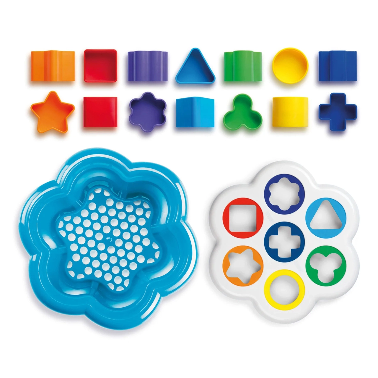 Il set include 14 pezzi colorati in 7 forme diverse e una pratica scatola a fiore con coperchio, in cui riporre tutto con facilità dopo il gioco. La struttura resistente e facile da lavare in plastica sicura garantisce una lunga durata del giocattolo.