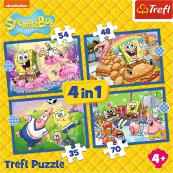 TREFL porta divertimento per tutta la famiglia con quattro puzzle Vita di SpongeBob in un'unica confezione. Ogni puzzle nel set ha un numero diverso di pezzi - 35, 48, 54 e 70, offrendo una opportunità unica per diversi livelli di abilità.